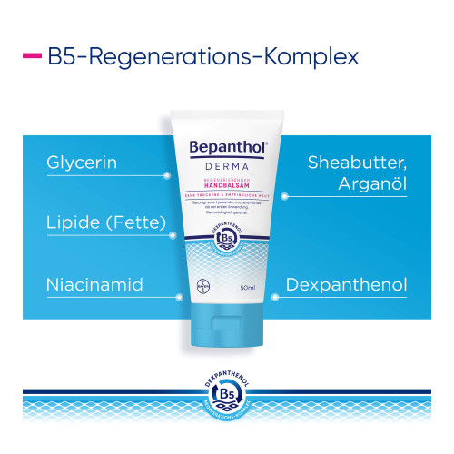 Bepanthol® Derma Handbalsam unterstützt die Regeneration der Hautschutzbarriere und versorgt sie mit Feuchtigkeit – von innen nach außen. Die Handpflegecreme für raue, strapazierte Hände enthält Dexpanthenol und ist dermatologisch getestet.