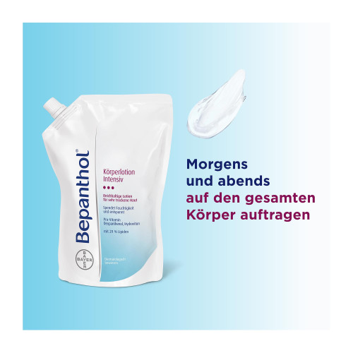 Bepanthol® Körperlotion Intensiv wurde für die tägliche Pflege sehr trockener, rauer und gespannter Haut entwickelt und wirkt rückfettend. Sie ist gut hautverträglich und zur Anwendung auch bei empfindlicher Haut geeignet.