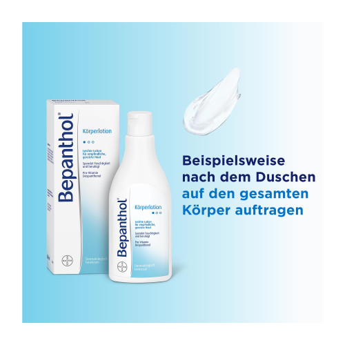 Verteilen Sie Bepanthol Körperlotion z. B. nach dem täglichen Duschen großzügig auf Ihrem gesamten Körper. Bei Bedarf wiederholen Sie die Anwendung mehrmals täglich.