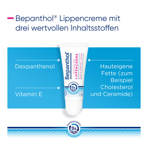 - Die Bepanthol® Lippencreme enthält Vitamin E, das als Radikalfänger freie Radikale unschädlich macht und so wirkungsvoll vor UV-bedingten Zellschäden schützt.