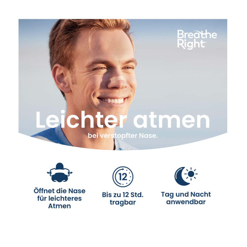 Breathe Right® Nasenstreifen öffnen sofort Ihre Nase, und helfen eine verstopfte Nase zu lindern. Dies spüren Sie sofort. Breathe Right Nasenstreifen lindern Ihre verstopfte Nase, sei es durch Erkältungen, Allergien oder eine Nasenscheidewandverkrümmung, indem sie Ihre Nasenlöcher erweitern und Ihnen helfen, leichter Luft aufzunehmen.