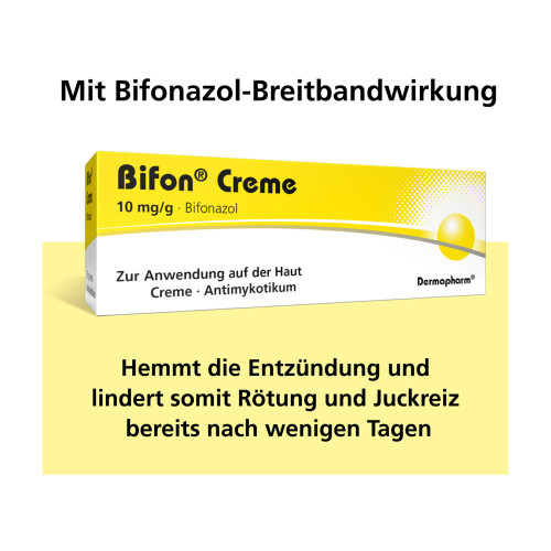 Bifon Creme 10 mg/g. Wirkstoff: Bifonazol. Anwendungsgebiete: Bei Pilzerkrankungen (Mykosen) der Haut, die durch Dermatophyten, Hefen, Schimmelpilze und andere Erreger wie z.B. Malassezia furfur oder Corynebacterium minutissimum hervorgerufen werden. Warnhinweis: Enthält Cetylstearylalkohol.
