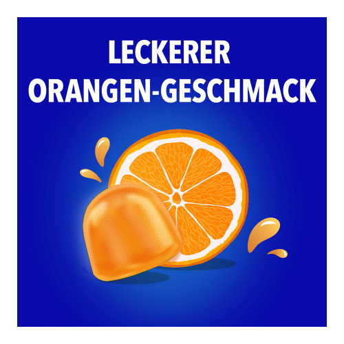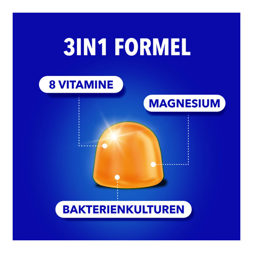 Glukosesirup; Zucker; Magnesiumcitrat; Wasser; Vitamin C (L-Ascorbinsäure); Geliermittel: Pektin; Maltodextrin; Niacin (Nicotinamid); Säureregulatoren: Natriumascorbat, Trinatriumcitrat; Bakterienstamm Bacillus coagulans SNZ 1969; Natürliches Orangenaroma; Modifizierte Stärke; Vitamin B6 (Pyridoxinhydrochlorid); Vitamin B2 (Riboflavin); Vitamin B1 (Thiaminhydrochlorid); Stabilisator: Gummi arabicum; Sonnenblumenöl; Farbstoff: Paprikaextrakt; Biotin (D-Biotin); Überzugsmittel: Carnaubawachs; Vitamin D (Cholecalciferol); Vitamin B12 (Cyanocobalamin).