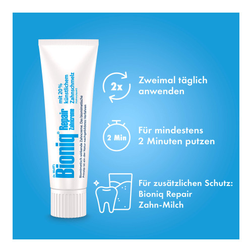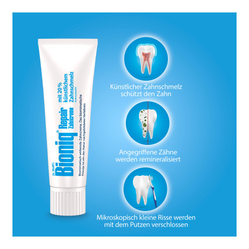Von der Natur lernen und das Wissen in innovative Produkte umsetzen: Die Bioniq Repair-Zahncreme basiert auf dieser Idee der Bionik/Biomimetik. Sie enthält Hydroxylapatit – eine Substanz, die dem menschlichen Zahnschmelz nachempfunden ist. Dieser Wirkstoff in der Bioniq Repair-Zahncreme hilft, den Zahnschmelzabtrag zu minimieren und sowohl Zähne als auch Zahnfleisch langfristig gesund zu halten.