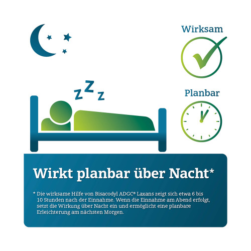 Bisacodyl Adgc Laxans 5 mg magensaftresistente Tabletten. Anwendungsgebiete: Zur kurzfristigen Anwendung bei Obstipation sowie bei Erkrankungen, die eine erleichterte Defäkation erfordern. Warnhinweise: Kinder über 6 Jahre und Erwachsene nehmen abends 1 bis 2 Tabletten Bisacodyl ADGC Laxans mit reichlich Flüssigkeit ein, wenn die Wirkung für den nächsten Morgen geplant ist. Bisacodyl ADGC Laxans ist für Kinder unter 6 Jahre nicht geeignet.