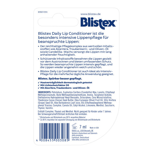Der reichhaltige Pflegekomplex aus wertvollen Inhaltsstoffen wie Aloe Vera, Traubenkern- und Oliven-Öl sowie Candelilla-Wachs versorgt die Lippen mit langanhaltender Feuchtigkeit. Schützende Inhaltsstoffe bewahren die Lippen gezielt vor dem Austrockenen und bieten umfassenden Schutz. So werden beanspruchte Lippen intensiv gepflegt, und die Lippen wieder angenehm weich und schön. Blistex Lip Conditioner ist auch ideal als Intensiv-Pflege für die mehrfache tägliche Anwendung geeignet.