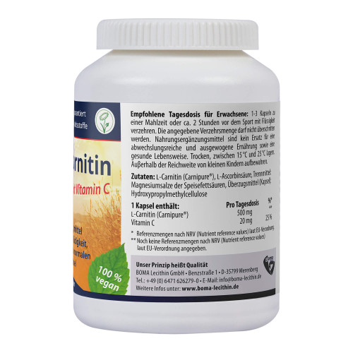 L-Carnitin von BOMA Lecithin enthält 500 mg reines L-Carnitin pro Kapsel, welches aus Carnipure® gewonnen wird. Carnipure® ist die natürlichste und reinste Form von L-Carnitin und wird biofermentativ hergestellt. Es gewährleistet somit höchste Reinheit und die beste Bioverfügbarkeit. L-Carnitin von BOMA Lecithin ist rein vegan und auch von der Vegan Society ausgezeichnet. Zusätzlich enthält es Vitamin C zur Unterstützung des Energiestoffwechsels und dem Schutz der Zellen vor oxidativem Stress. Zudem trägt Vitamin C zur Verringerung von Müdigkeit und Ermüdung bei und dient einer normalen Funktion des Immunsystems während und nach intensiver, körperlicher Betätigung.