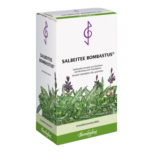 Salbeitee Bombastus. Wirkstoff: Salbeiblätter, geschnitten. Anwendungsgebiete: Der Arzneitee wird innerlich angewendet bei Verdauungsbeschwerden mit leichten Krämpfen im Magen-Darm-Bereich, Völlegefühl, Blähungen sowie bei vermehrter Schweißsekretion. Äußerliche Anwendung bei Entzündungen der Mund- und Rachenschleimhaut.
