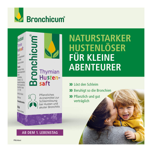 Bronchicum® Thymian Hustensaft. Wirkstoff: Fluidextrakt aus Thymiankraut. Anwendungsgebiete: Zur Besserung der Beschwerden bei Erkältungskrankheiten der Atemwege mit zähflüssigem Schleim und zur Besserung der Beschwerden bei akuter Bronchitis. Warnhinweis: Enthält 5,8 Vol.-% Alkohol. Packungsbeilage beachten.