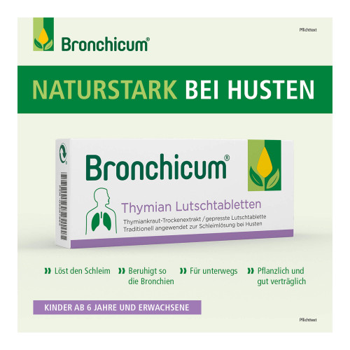 Bronchicum® Thymian Lutschtabletten. Wirkstoff: Thymiankraut-Trockenextrakt. Anwendungsgebiete: Traditionell angewendet zur Unterstützung der Schleimlösung bei Husten im Rahmen von Erkältungen. Hinweis: Traditionelles pflanzliches Arzneimittel zur Anwendung bei: „Zur Unterstützung der Schleimlösung bei Husten im Rahmen von Erkältungen“, ausschließlich auf Grund langjähriger Anwendung. Warnhinweis: Enthält Sucrose.