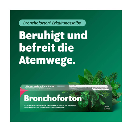 Bronchoforton Salbe 10 %/10 %/5 %. Anwendungsgebiete: Zur Anwendung bei Kindern ab 4 Jahren und Erwachsenen. Zur Inhalation und äußerlichen Anwendung zur Besserung der Beschwerden bei Erkältungskrankheiten der Atemwege mit zähflüssigem Schleim. Warnhinweis: Enthält Stearylalkohol.