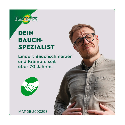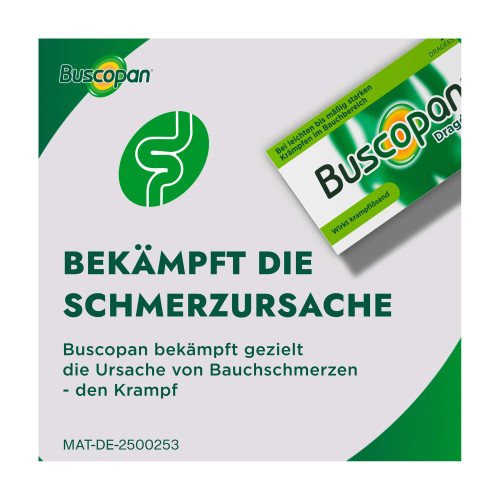 Buscopan® Dragées 10 mg Überzogene Tablette. Wirkstoff: Butylscopolaminiumbromid. Anwendungsgebiete: Zur Behandlung von leichten bis mäßig starken Krämpfen des Magen-Darm-Traktes, sowie zur Behandlung krampfartiger Bauchschmerzen beim Reizdarmsyndrom. Warnhinweis: Enthält Sucrose (Zucker).