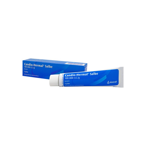 Candio-Hermal Salbe. Wirkstoff: Nystatin. Anwendungsgebiete: bei nichtnässenden Hautinfektionen mit nystatinempfindlichen Hefepilzen, z.B. bei Befall der Hände und Füße, der Nägel und Nagelränder, der Mundwinkel, des äußeren Gehörgangs, des Anal- und Genitalbereiches.