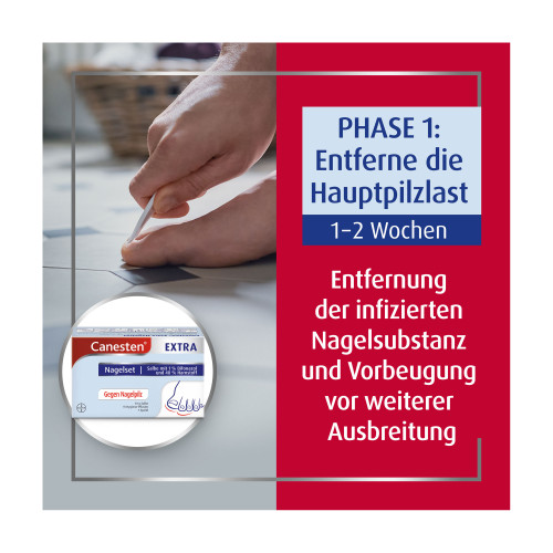 Canesten Extra Nagelset. Anwendungsgebiete: Zur nagelablösenden Behandlung von Pilzerkrankungen der Nägel an Händen und Füßen mit gleichzeitiger gegen Pilze gerichteter (antimykotischer) Wirkung. Warnhinweis: Enthält Wollwachs.