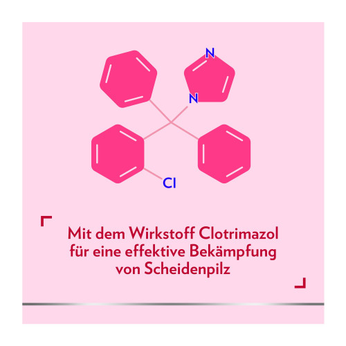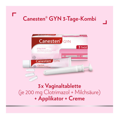 Canesten® GYN 3-Tage Kombi. Wirkstoff: Clotrimazol. Infektiöser Ausfluss, verursacht durch Hefepilze; Entzündungen der Scheide durch Pilze - meist Hefepilze der Gattung Candida - sowie überlagernde Infektionen (Superinfektionen) mit clotrimazolempfindlichen Bakterien. Warnhinweis für die Creme: Enthält Cetylstearylalkohol.