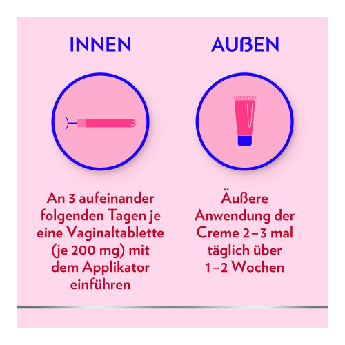 Vaginaltabletten: Die Behandlung mit den Vaginaltabletten an 3 aufeinander folgenden Tagen ist in der Regel ausreichend, um eine Pilzinfektion zu beseitigen. Falls erforderlich, kann jedoch ein zweiter Behandlungszyklus angeschlossen werden. Im Allgemeinen gehen die Anzeichen einer Scheidenentzündung, die durch Pilze verursacht ist (wie Juckreiz, Ausfluss, Brennen), innerhalb der ersten vier Tage nach Beginn der Behandlung deutlich zurück. Falls nach 4 Tagen keine deutliche Besserung der Symptome eintritt, wenden Sie sich bitte an Ihren Arzt.