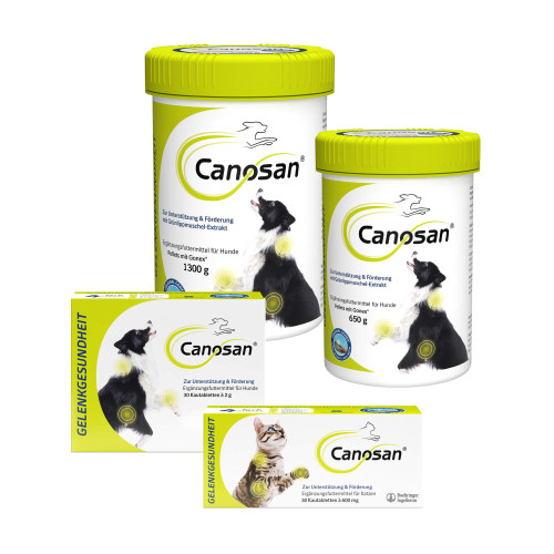 - Ausgewachsene Hunde: Canosan reguliert den Gelenk- und Bindegewebsstoffwechsel und hat so einen positiven Einfluss auf die Gelenke.