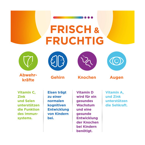 Süßungsmittel Xylit, Magnesiumoxid, Calciumhydrogenphosphat, L-Ascorbinsäure, Säureregulator: E 330; Maltodextrin, Emulgatoren: E 470b, E 570; Trennmittel: E 551; Eisen-II-fumarat, Füllstoff: E 460; Palmöl, DL-alpha-Tocopherylacetat, Aroma, modifizierte Stärke, Nicotinamid, Zinkoxid, Kaliumchlorid, Calcium-D-Pantothenat, Süßungsmittel Aspartam**, Gelatine, Mangan-II-sulfat, Stärke, Thiaminmononitrat, Pyridoxinhydrochlorid, Retinylacetat, Riboflavin, Pteroylmonoglutaminsäure, D-Biotin, Natriumselenat, Antioxidationsmittel: E 321; Phyllochinon, Cholecalciferol, Cyanocobalamin.