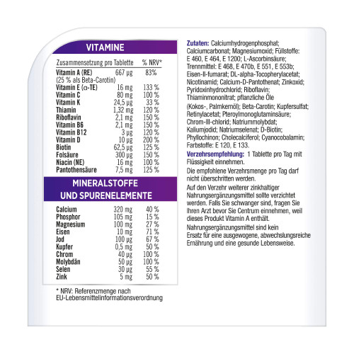 Calciumhydrogenphosphat; Calciumcarbonat; Magnesiumoxid; Füllstoffe: E 460, E 464, E 1200; L-Ascorbinsäure; Trennmittel: E 468, E 470b, E 551, E 553b; Eisen-II-fumarat; DL-alpha-Tocopherylacetat; Nicotinamid; Calcium-D-Pantothenat; Zinkoxid; Pyridoxinhydrochlorid; Riboflavin; Thiaminmononitrat; pflanzliche Öle (Kokos-, Palmkernöl); Beta-Carotin; Kupfersulfat; Retinylacetat; Pteroylmonoglutaminsäure; Chrom-III-chlorid; Natriummolybdat; Kaliumjodid; Natriumselenat; D-Biotin; Phyllochinon; Cholecalciferol; Cyanocobalamin; Farbstoffe: E 120, E 133.