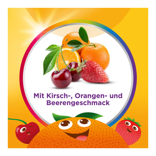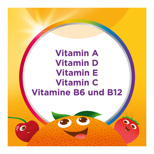 Glukosesirup; Zucker; Gelatine; L-Ascorbinsäure; Wasser; Säuerungsmittel: Citronensäure; Nicotinamid; DL-alpha-Tocopherylacetat; Zinksulfat; natürliche Aromen 0,25 % (natürliches Orangenaroma, natürliches Kirschenaroma mit weiteren natürlichen Aromen, natürliches Erdbeeraroma); färbende Lebensmittelkonzentrate 0,22 % (Karotte, Schwarze Johannisbeere); pflanzliche Öle (Kokos-, Rapsöl); färbende Lebensmittelkonzentrate <0,1 % (Roter Rettich, Färberdistel, Schwarze Karotte, Kirsche); Pyridoxinhydrochlorid; Retinylacetat; Überzugsmittel: Carnaubawachs, Bienenwachs; Kaliumiodid; D-Biotin; Cholecalciferol; Cyanocobalamin.