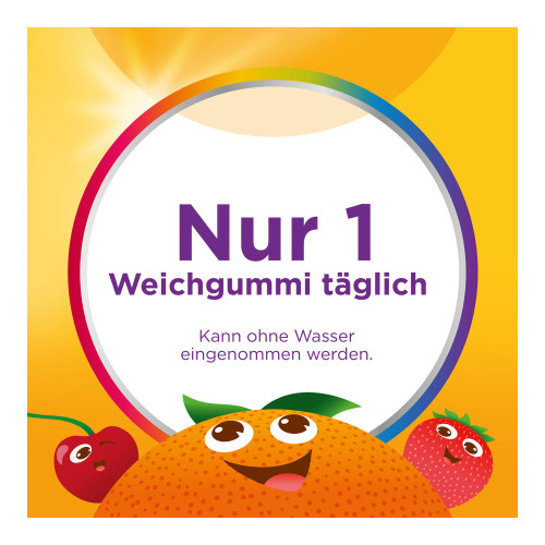 Centrum Vitamin Gummies vereinen wichtige Vitamine und Mineralstoffe in Form von Gummibärchen als Alternative zu Tabletten. Die KIDS MULTI Vitamin Gummies beinhalten acht Vitamine und zwei essentielle Mineralstoffe, um das allgemeine Wohlbefinden von Kindern ab 4 Jahren zu fördern: Vitamin C, D und Zink tragen zu einer normalen Funktion des Immunsystems bei und unterstützen so gezielt die Abwehrkräfte. Vitamin D wird für ein gesundes Wachstum und eine gesunde Entwicklung der Knochen bei Kindern benötigt.