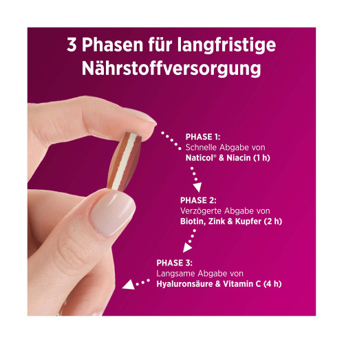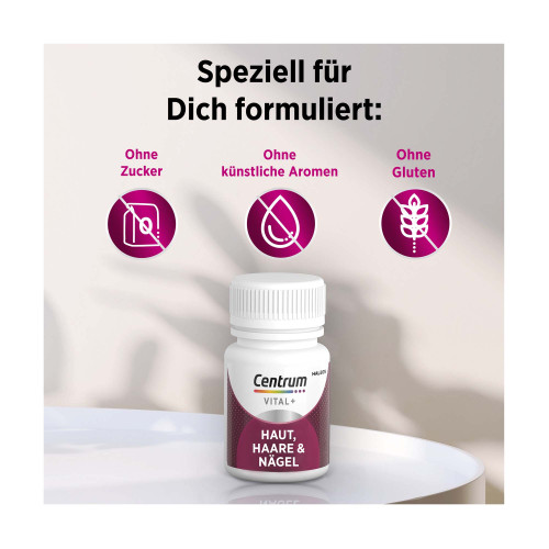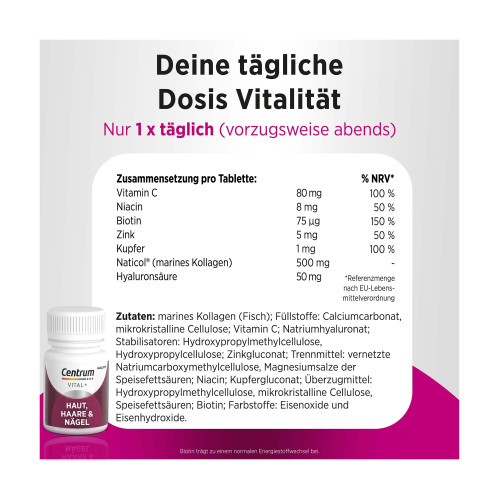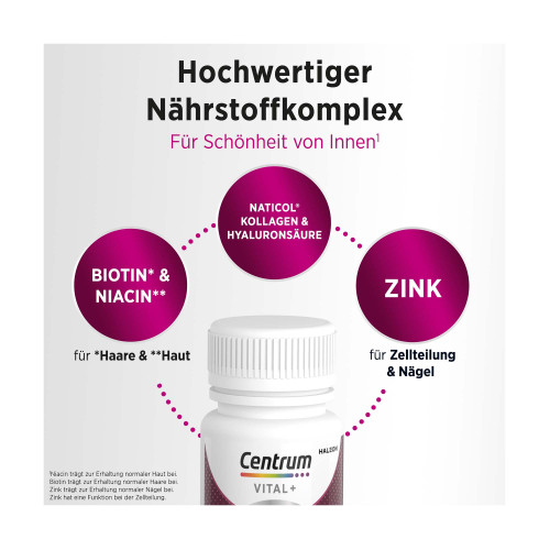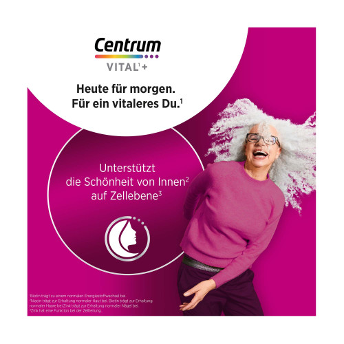 Centrum Vital1+ Haut, Haare & Nägel2 bietet einen hochwertigen 3-Phasen Nährstoffkomplex für Schönheit von Innen2 und Zellregeneration3. Im Alter verändert sich unser Erscheinungsbild, wodurch Haut, Haare und Nägel beeinträchtigt werden können. Damit der Körper während dieser Veränderungen optimal/gut versorgt wird, benötigt er spezifische Nährstoffe. Hier kann Centrum Vital1+ Haut, Haare & Nägel3 als wertvolle Ergänzung dienen. Die darin enthaltenen Mikronährstoffe tragen zur Unterstützung eines vitalen Erscheinungsbildes bei. Der Nährstoffkomplex enthält marines Kollagen und Hyaluronsäure. Hinzu kommen Niacin, das zur Erhaltung normaler Haut beiträgt, Biotin welches zur Erhaltung normaler Haare beiträgt und Zink, das zur Erhaltung normaler Nägel beiträgt. Die 3-Phasen-Technologie setzt die Nährstoffe in drei Phasen frei und sorgt dadurch für eine optimierte Nährstoffaufnahme. Der Schlüssel für körperliche Vitalität liegt in den Zellen. Deshalb unterstützt Centrum Vital1+ Haut, Haare & Nägel2 während der nächtlichen Regenerationsphase auch die Zellerneuerung3. Zink spielt dabei eine wichtige Rolle, da es eine Funktion bei der Zellteilung hat und somit den Zellstoffwechsel unterstützt. Die Einnahme von Centrum Vital1+ Haut, Haare & Nägel2 ist einfach und komfortabel. Die Filmtabletten sind ummantelt und daher leicht zu schlucken.