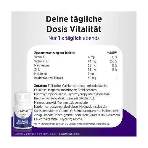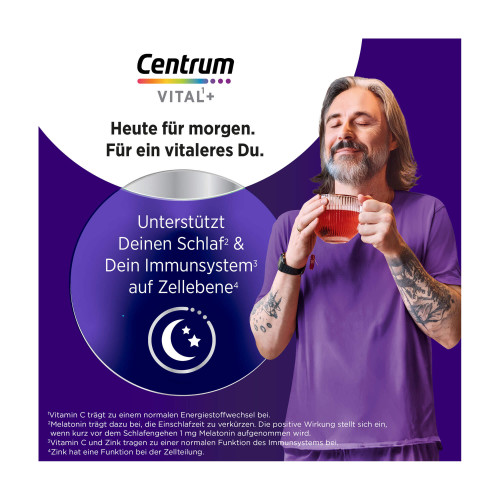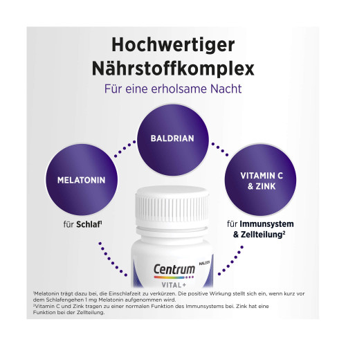 Centrum Vital1+ Schlaf2 & Immunsystem3 bietet einen hochwertigen 2-Phasen Nährstoffkomplex für erholsamen Schlaf2, Immunsystem3 und Zellregeneration4. Mit zunehmenden Alter lassen sich Veränderungen im Schlafmuster feststellen. Außerdem nimmt im Alter die Funktion des Immunsystems ab. Um den Körper für einen erholsamen Schlaf und ein starkes Immunsystem zu unterstützen, benötigt er spezifische Nährstoffe. Hier kann Centrum Vital+ Schlaf & Immunsystem als wertvolle Ergänzung dienen. Die darin enthaltenen Mikronährstoffe tragen zur Unterstützung dieser wichtigen Funktionen bei. Neben Baldarian enthält unser Nährstoffkomplex Melatonin, welches trägt dazu bei, die Einschlafzeit zu verkürzen. Die positive Wirkung stellt sich ein, wenn kurz vor dem Schlafengehen 1 mg Melatonin aufgenommen wird. Darüber hinaus tragen Vitamin C und Zink zu einer normalen Funktion des Immunsystems bei. Die 2-Phasen-Technologie setzt die Nährstoffe in zwei Phasen frei und sorgt dadurch für eine optimierte Nährstoffaufnahme. Der Schlüssel für körperliche Vitalität liegt in den Zellen. Deshalb unterstützt unterstützt Centrum Vital1+ Schlaf2 & Immunsystem3 während der nächtlichen Regenerationsphase auch die Zellerneuerung. Zink spielt dabei eine wichtige Rolle, da es eine Funktion bei der Zellteilung hat und somit den Zellstoffwechsel unterstützt. Die Einnahme von Centrum Vital+ Schlaf & Immunsystem ist einfach und komfortabel. Die Filmtabletten sind umhüllt und deshalb leicht zu schlucken.