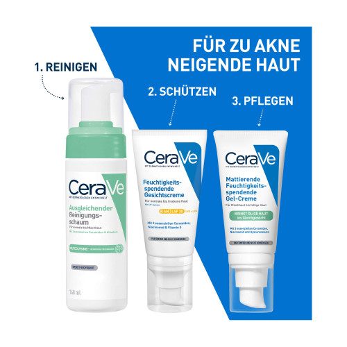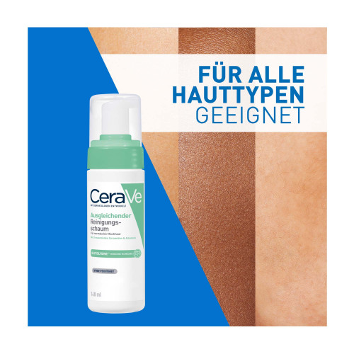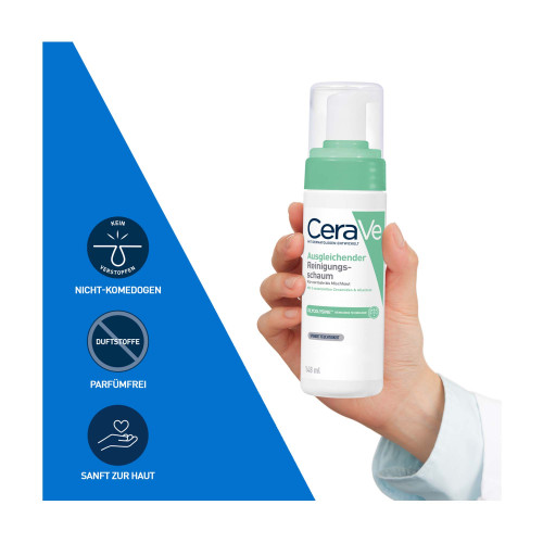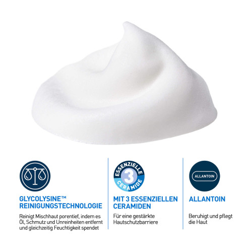 Der CeraVe Ausgleichende Reinigungsschaum mit Allantoin und den drei essenziellen Ceramiden 1, 3 und 6-II reinigt die Haut sanft und ohne zu Reiben, versorgt sie mit Feuchtigkeit und mattiert Glanz auf der T-Zone. Während Ceramide die natürliche Hautbarriere schützen, beruhigt und pflegt Allantoin die Haut. Sanfte und gründliche Reinigung dank Glycolysine™-Reinigungstechnologie Die CeraVe-Gesichtsreinigung reinigt dank Glycolysine™-Technologie die Haut porentief, indem sie Öl, Schmutz und Unreinheiten entfernt und gleichzeitig Feuchtigkeit spendet. Dazu ist der Reiniger parfümfrei, parabenfrei und nicht komedogen.