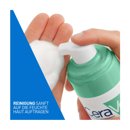 Den CeraVe Ausgleichenden Reinigungsschaum in die Handflächen geben und auf die angefeuchtete Haut an Gesicht, Hals sowie bei Bedarf an Rücken und Dekolleté auftragen. Anschließend sanft einmassieren, um Schmutz und Talg zu entfernen, und mit lauwarmem Wasser gründlich abspülen. Die Augenpartie aussparen.