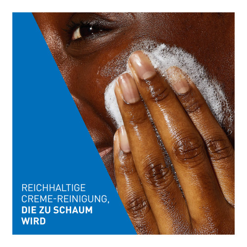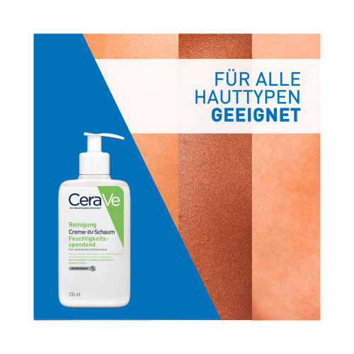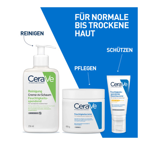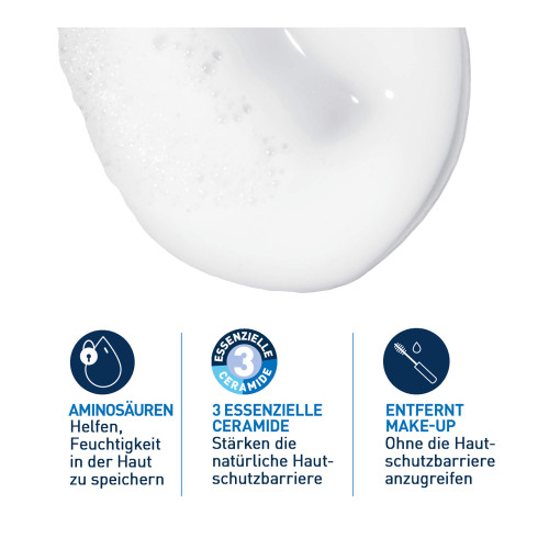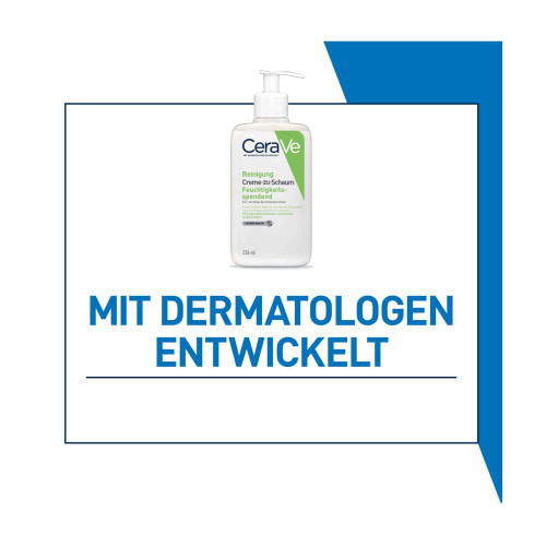 Die feuchtigkeitsspendende Creme-zu-Schaum Reinigung von CeraVe ist eine Reinigungscreme für normale bis trockene Haut. Die Creme reinigt sanft, entfernt Make-up und spendet Feuchtigkeit, ohne die Hautschutzbarriere anzugreifen. Die milde Gesichtsreinigung verwandelt sich beim Auftragen auf die Haut in einen weichen Schaum, der wirksam Verunreinigungen und Make-up entfernt – ohne der Haut die natürliche Feuchtigkeit zu entziehen. Die Formel ist mit Hyaluronsäure, Aminosäuren und Ceramiden angereichert. Diese Inhaltsstoffe versorgen trockene Haut intensiv mit Feuchtigkeit. Die CeraVe Gesichtsreinigung für empfindliche Haut wurde zusammen mit Dermatologen entwickelt.