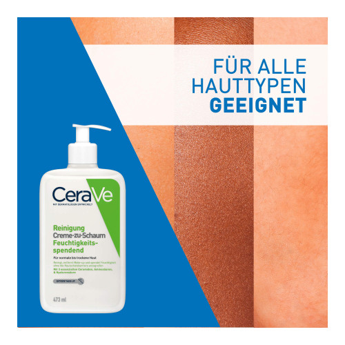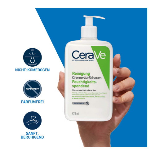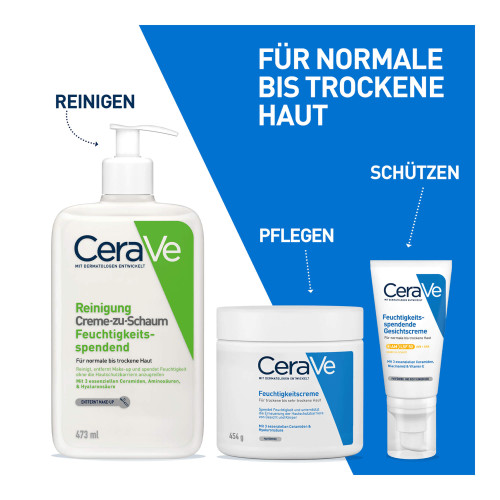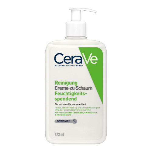 Die feuchtigkeitsspendende Creme-zu-Schaum Reinigung von CeraVe ist eine Reinigungscreme für normale bis trockene Haut. Die Creme reinigt sanft, entfernt Make-up und spendet Feuchtigkeit, ohne die Hautschutzbarriere anzugreifen. Die milde Gesichtsreinigung verwandelt sich beim Auftragen auf die Haut in einen weichen Schaum, der wirksam Verunreinigungen und Make-up entfernt – ohne der Haut die natürliche Feuchtigkeit zu entziehen. Die Formel ist mit Hyaluronsäure, Aminosäuren und Ceramiden angereichert. Diese Inhaltsstoffe versorgen trockene Haut intensiv mit Feuchtigkeit. Die CeraVe Gesichtsreinigung für empfindliche Haut wurde zusammen mit Dermatologen entwickelt.