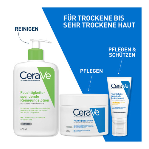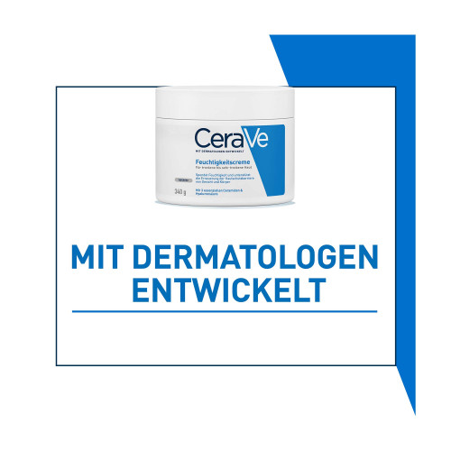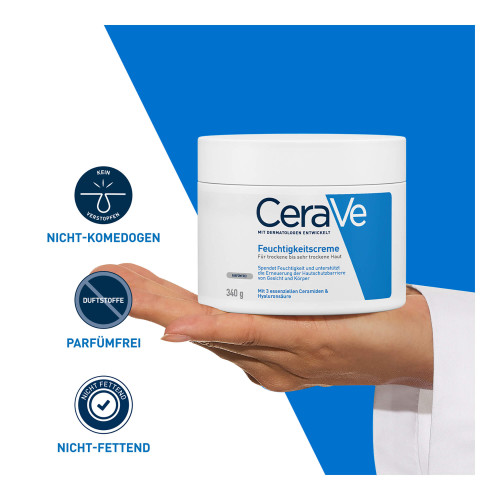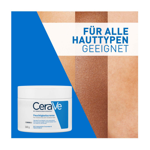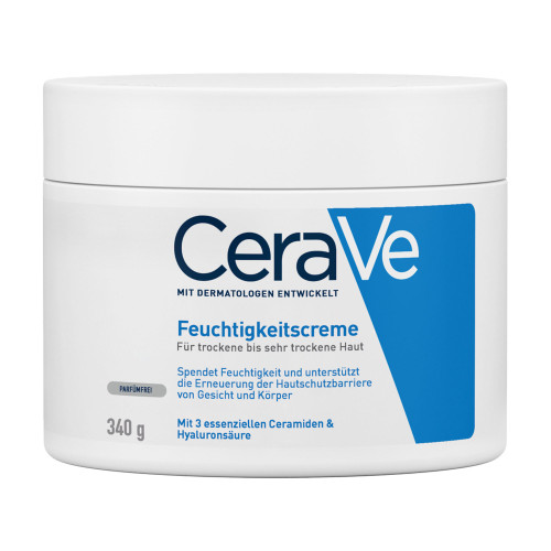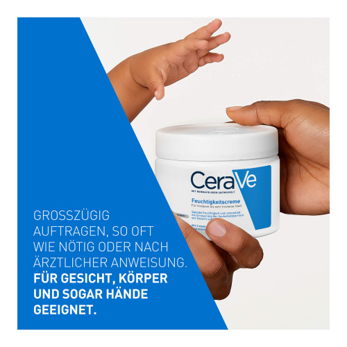 Die CeraVe Feuchtigkeitscreme für Gesicht und Körper hydratisiert die Haut, beugt Austrocknung vor und stärkt die Hautschutzbarriere. CeraVe Feuchtigkeitscreme für trockene bis sehr trockene Haut Die Hautpflege zeichnet sich durch ihre patentierte MVE-Wirkstoff-Freisetzung aus, die die aktiven Wirkstoffe über den Tag verteilt an die Haut freigibt. Dank Hyaluron und drei essenziellen Ceramiden wird die Haut kontinuierlich mit Feuchtigkeit versorgt und die natürliche Hautschutzbarriere gestärkt – für ein angenehm weiches Hautgefühl. Die CeraVe Feuchtigkeitscreme enthält keine Dufstoffe und eignet sich auch bei zu Neurodermitis neigende Haut und für Allergiker.