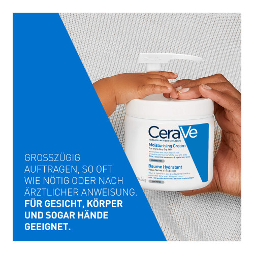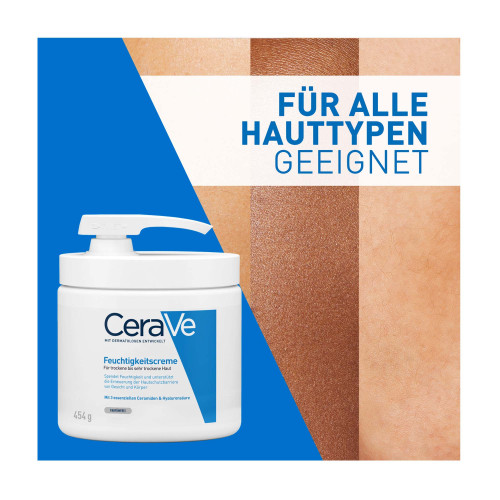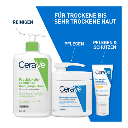 Die CeraVe Feuchtigkeitscreme für Gesicht und Körper hydratisiert die Haut, beugt Austrocknung vor und stärkt die Hautschutzbarriere. CeraVe Feuchtigkeitscreme für trockene bis sehr trockene Haut Die Hautpflege zeichnet sich durch ihre patentierte MVE-Wirkstoff-Freisetzung aus, die die aktiven Wirkstoffe über den Tag verteilt an die Haut freigibt. Dank Hyaluron und drei essenziellen Ceramiden wird die Haut kontinuierlich mit Feuchtigkeit versorgt und die natürliche Hautschutzbarriere gestärkt – für ein angenehm weiches Hautgefühl. Die CeraVe Feuchtigkeitscreme enthält keine Dufstoffe und eignet sich auch bei zu Neurodermitis neigende Haut und für Allergiker.