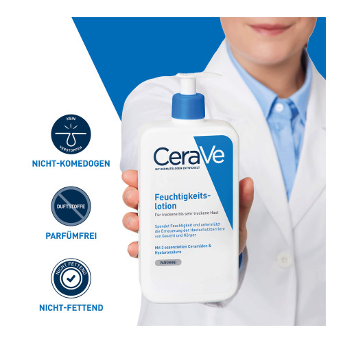 Die CeraVe Feuchtigkeitslotion versorgt das Gesicht und den Körper mit bis zu 24 Stunden intensiver Feuchtigkeit. Zudem stärkt und schützt sie die natürliche Hautschutzbarriere und enthält keine Duftstsoffe. Die Hautpflege mit Hyaluron und den essenziellen Ceramiden 1, 3 und 6-II durchfeuchtet und regeneriert die Haut. Dank der innovativen MVE-Technologie, werden die enthaltenen aktiven Wirkstoffe kontinuierlich freigesetzt – für eine langanhaltende Wirkung und ein angenehmes Hautgefühl. Durch die milde Formulierung eignet sich die Körperlotion von CeraVe auch für zu Neurodermitis und Allergien neigende Haut.