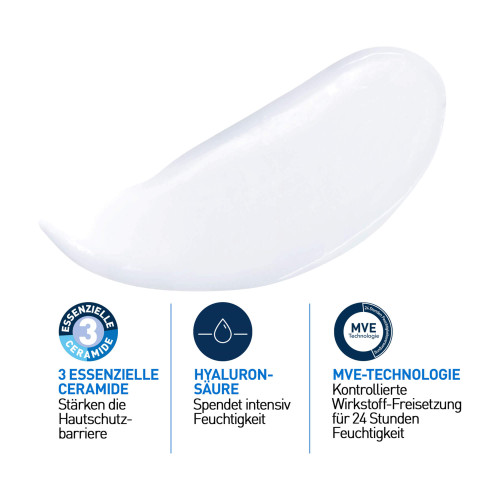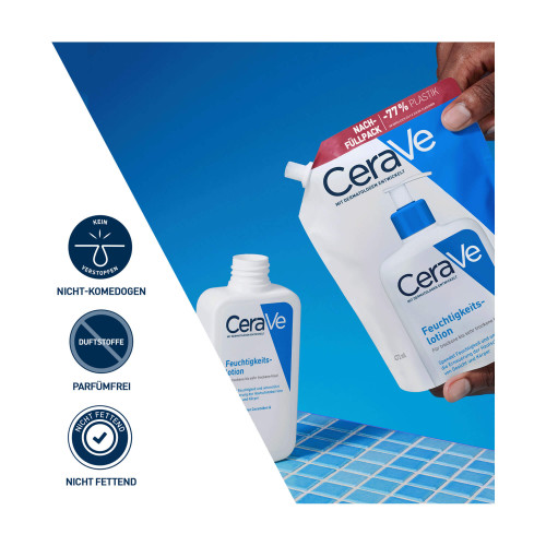 Die CeraVe Feuchtigkeitslotion versorgt das Gesicht und den Körper mit bis zu 24 Stunden intensiver Feuchtigkeit. Zudem stärkt und schützt sie die natürliche Hautschutzbarriere und enthält keine Duftstsoffe. Die Hautpflege mit Hyaluron und den essenziellen Ceramiden 1, 3 und 6-II durchfeuchtet und regeneriert die Haut. Dank der innovativen MVE-Technologie, werden die enthaltenen aktiven Wirkstoffe kontinuierlich freigesetzt – für eine langanhaltende Wirkung und ein angenehmes Hautgefühl. Durch die milde Formulierung eignet sich die Körperlotion von CeraVe auch für zu Neurodermitis und Allergien neigende Haut.