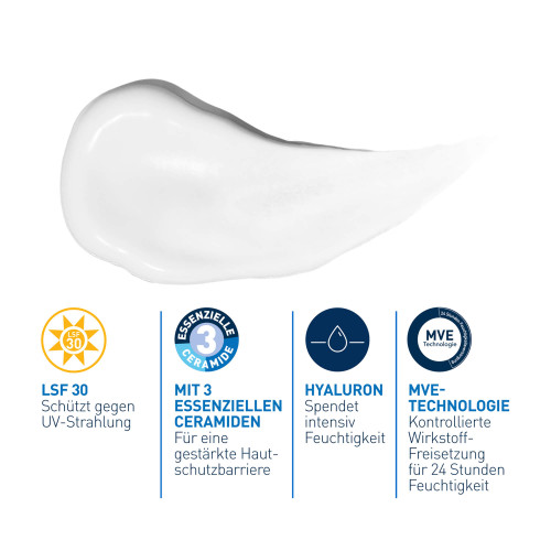 Die Tagescreme mit Lichtschutz von CeraVe durchfeuchtet die Haut und versorgt sie mit wirksamen Inhaltsstoffen. Dank der patentierten Wirkstoff-Freisetzung (MVE) werden die Inhaltsstoffe über den Tag verteilt freigesetzt und hinterlassen ein langanhaltend seidiges und geschmeidiges Hautgefühl. Die sante Formel mit Hyaluron versorgt trockene Haut intensiv mit Feuchtigkeit, die Ceramide 1, 3 und 6-II stärken die natürliche Hautschutzbarriere und der LSF 30 schützt vor UVA- und UVB-Strahlen. Die nicht-komedogene Creme verzichtet auf Duftstoffe und Parabene.