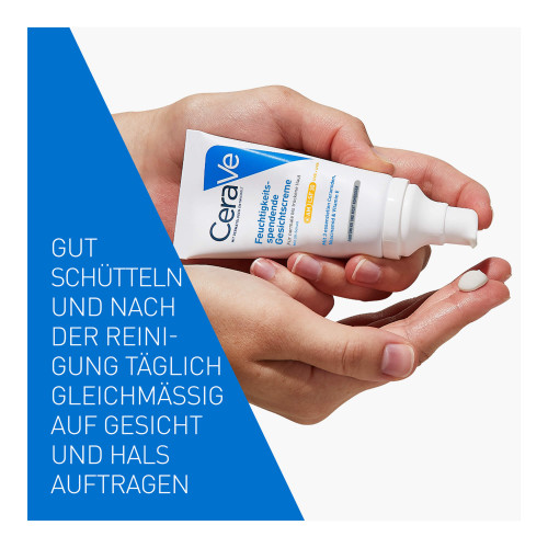 Eine kleine Menge der CeraVe Feuchtigkeitsspendende Gesichtscreme mit LSF 30 täglich am Morgen auf die gereinigte Haut auftragen und sanft mit den Fingerspitzen einmassieren.