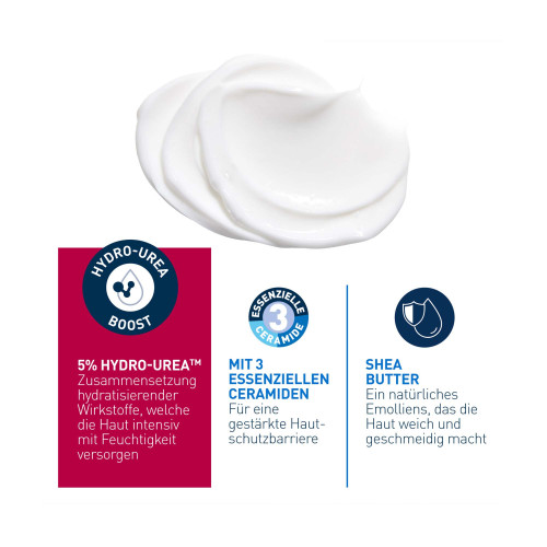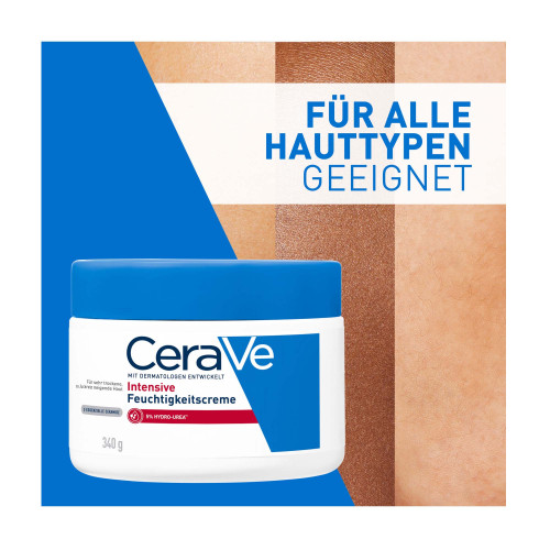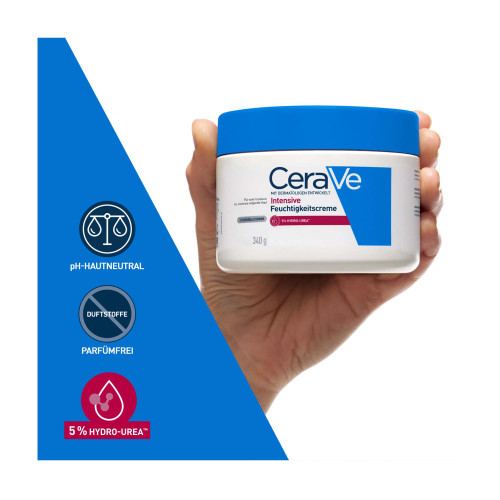 Die CeraVe Intensive Feuchtigkeitscreme mit 5 % Hydro-Urea-Komplex, Sheabutter sowie den drei essenziellen Ceramiden 1, 3 und 6-II versorgt trockene Haut bis zu 72H lang intensiv mit Feuchtigkeit und lindert sanft trockenheitsbedingten Juckreiz – für ein spürbar weicheres, angenehmeres Hautgefühl. Intensiver Feuchtigkeitsboost und verträgliche Formulierung Dank ihrer pH-neutralen Formulierung ohne Parfüm sowie ihrer reichhaltigen, nicht fettenden Textur ist die intensive Feuchtigkeitspflege von CeraVe für alle Hauttypen geeignet – auch für Allergiker.