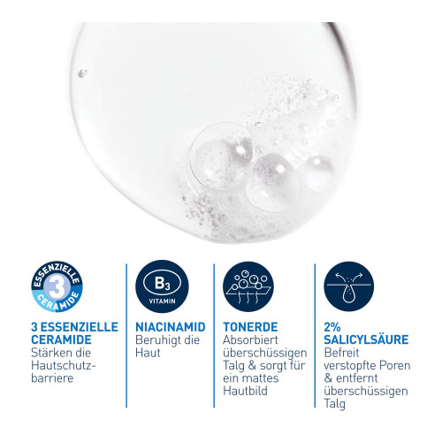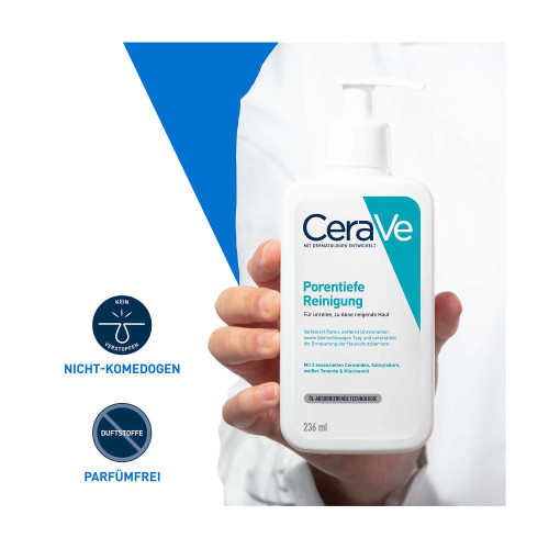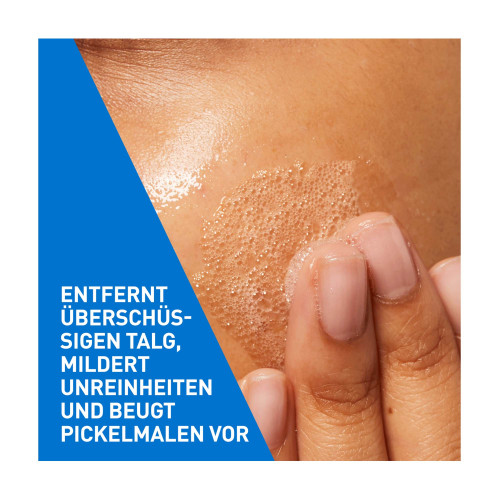 Die Porentiefe Reinigung von CeraVe befreit empfindliche Gesichtshaut sanft von überschüssigem Talg und wirkt Unreinheiten entgegen. Sie enthält Niacinamid und Salicylsäure, die abgestorbene Hautzellen entfernt und einer Verstopfung der Poren vorbeugt. Der Reinigungsschaum von CeraVe entfernt überschüssiges Öl durch den Reinigungsprozess und wurde speziell für fettige Haut entwickelt, die zu Unreinheiten und Akne neigt. Dabei entfernt die Reinigung überschüssigen Talg und trocknet die Haut nicht aus. Essenzielle Ceramide tragen zur Stärkung der Hautschutzbarriere bei.