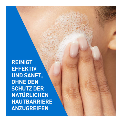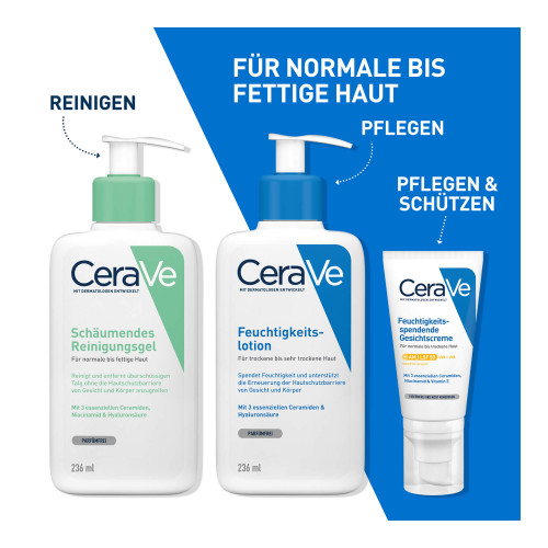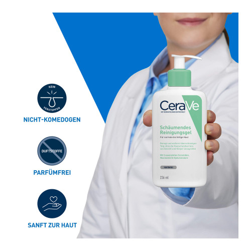 Als Teil der morgendlichen und/oder abendlichen Pflegeroutine eine kleine Menge des CeraVe Schäumendes Reinigungsgel aus dem Pumpspender entnehmen und mit etwas Wasser in den Handflächen aufschäumen. Den zarten Schaum anschließend auf die Haut auftragen und sanft einmassieren. Dank seiner besonders gut verträglichen Formel, eignet sich das Reinigungsgel für die tägliche Reinigung – auch unter der Dusche. Besonders effizient wirkt es in Kombination mit der passenden CeraVe Feuchtigkeitslotion (PZN 14017553).