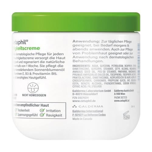 Cetaphil Feuchtigkeitscreme ist eine besonders sanfte und verträgliche Hautpflege mit stärkender und feuchtigkeitsspendender Wirkung. Je nach Hautzustand empfehlen wir nach der Hautreinigung (z.B. mit der Cetaphil Reinigungslotion) morgens und/oder abends eine ausreichend große Menge auf die Haut aufzutragen. Sobald die Haut wieder ein wenig spannt oder juckt – sie also „Durst“ hat – einfach nachcremen - ein Zuviel gibt es nicht. Sie kennen Ihre Haut am besten!