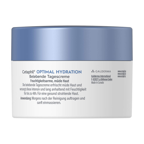 - Cetaphil® Optimal Hydration Belebende Tagescreme (PZN 17259104): Pflegt mit HydroSensitiv Complex, sowie wertvollen Lipiden aus Sheabutter & Phytosqualan und lässt die Haut bereits nach 1 Woche glatter und ebenmäßiger wirken.