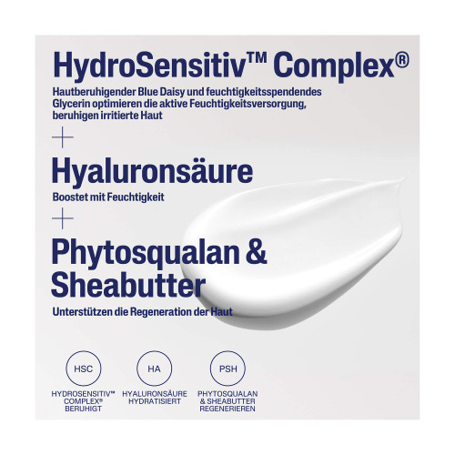 - Innovativer HydroSensitiv™ Complex optimiert die aktive Feuchtigkeitsversorgung, beruhigt irritierte Haut und stärkt die geschwächte Barrierefunktion.