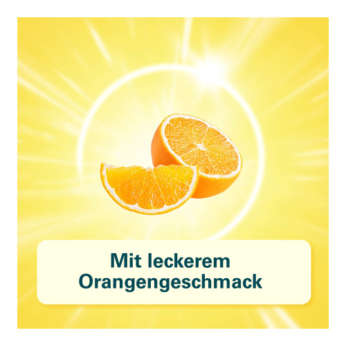 Natrium-L-Ascorbat, L-Ascorbinsäure, Süßungsmittel: Sorbit, Aspartam, Acesulfam K, Neohesperidin DC, Natriumsaccharin; Trennmittel: Speisefettsäuren, Magnesiumsalze der Speisefettsäuren, Talkum, Cellulose; Stabilisatoren: Hydroxypropylmethylcellulose, Hydroxypropylcellulose; Orangenaroma, Farbstoffe: Titandioxid, Paprikaextrakt; Säureregulator: Äpfelsäure; mittelkettige Triglyceride.