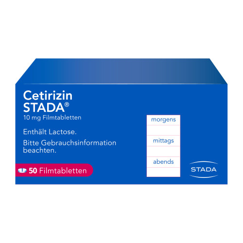 Cetirizin STADA® 10 mg Filmtabletten. Wirkstoff: Cetirizindihydrochlorid. Anwendungsgebiete: Zur Linderung von Nasen- und Augensymptomen bei saisonaler und ganzjähriger allergischer Rhinitis; Linderung von chronischer Nesselsucht (chronische idiopathische Urtikaria). Warnhinweis: Enthält Lactose.