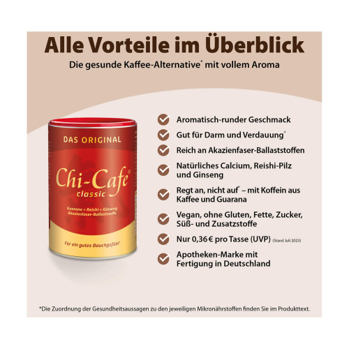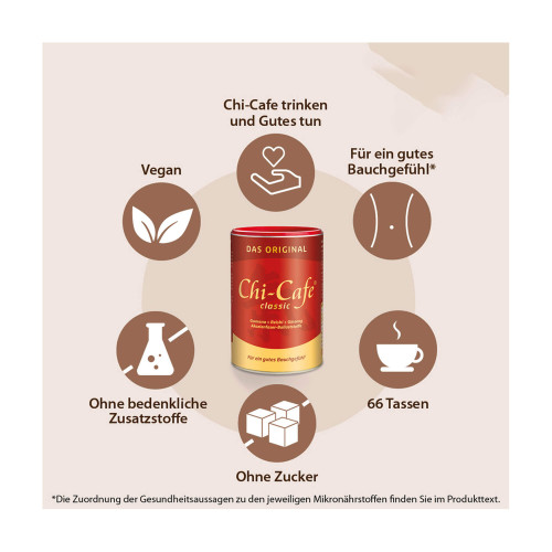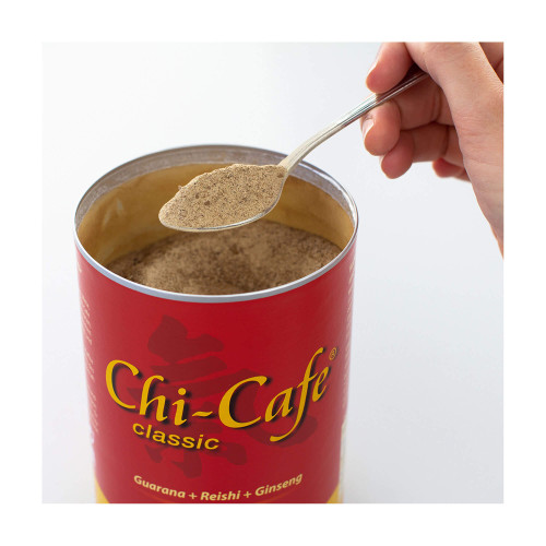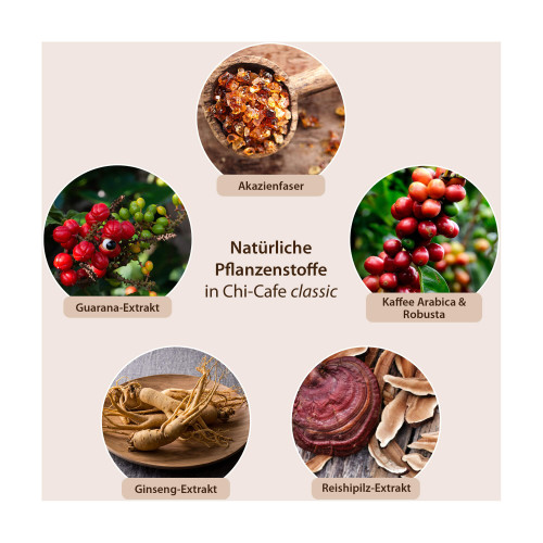 Chi-Cafe classic ist mehr als nur ein Kaffee. Mit seiner feinen Komposition weckt er sanft das „Chi“, die Lebensenergie1, und beflügelt Geist und Gemüt. Als erstes ballaststoffreiches Kaffeegetränk mit aromatisierenden Pflanzenextrakten sorgt er bereits seit 20 Jahren für puren Genuss. In jeder Tasse vereinen sich die edlen Noten der erlesenen Kaffeesorten Arabica und Robusta. Die Akazienfaser in Chi-Cafe classic liefert nicht nur wertvolle lösliche Ballaststoffe, sondern verleiht ihm auch ein geschmeidiges Mundgefühl. Ausgewählte Pflanzenextrakte aus Ginseng, Guarana und dem Reishi-Pilz sorgen für eine besondere aromatische Tiefe. Gönnen Sie sich einen Moment der Ruhe und lassen Sie sich von diesem einzigartigen Kaffee verwöhnen.