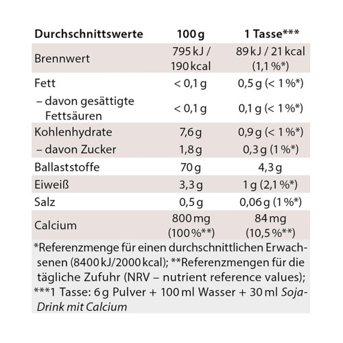 *** 1 Tasse: 6 g Pulver + 100 ml Wasser + 30 ml Soja-Drink mit Calcium