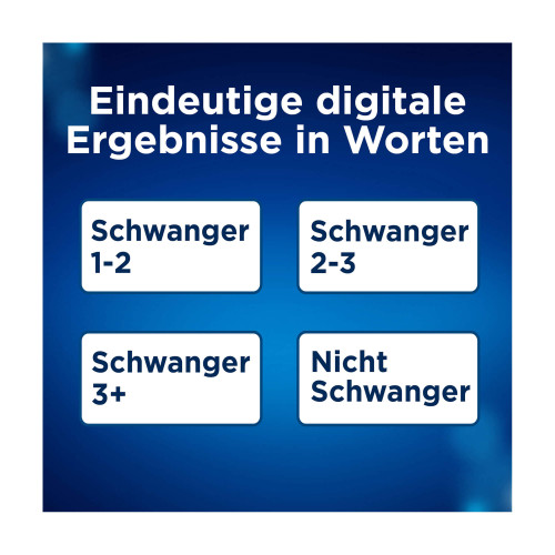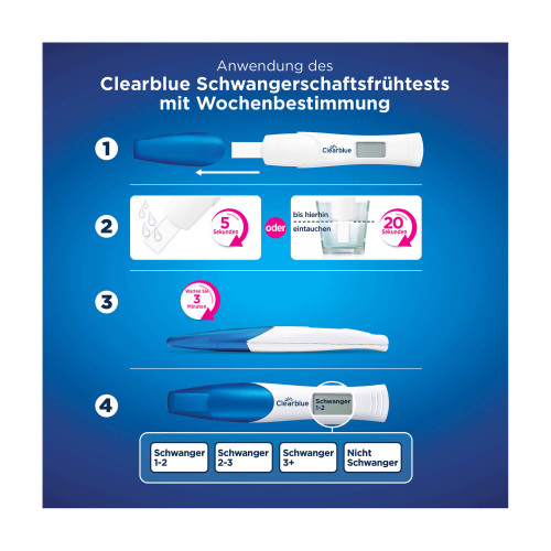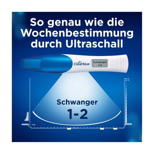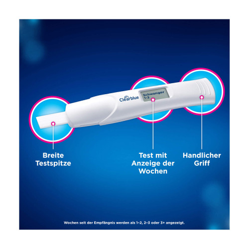 Der Clearblue Schwangerschaftstest mit Wochenbestimmung ist der bisher einzige Test, der bei der Bestimmung der Schwangerschaftswoche genauso zuverlässig ist wie eine Ultraschalluntersuchung. Der Smart Dual Sensor™ zeigt Ihnen nicht nur in Textform an, ob Sie schwanger sind oder nicht, sondern nennt auch die Schwangerschaftswoche.