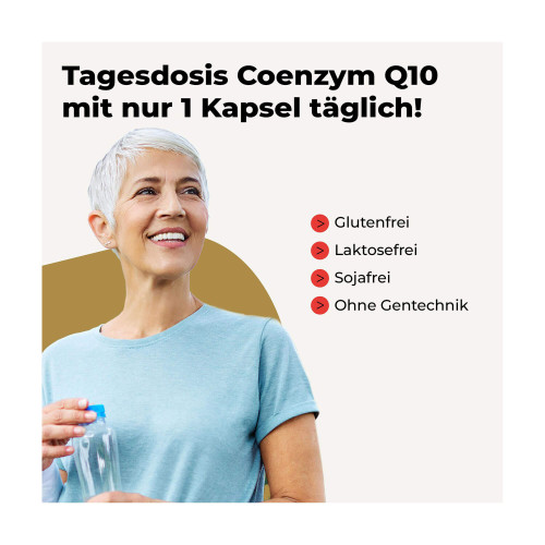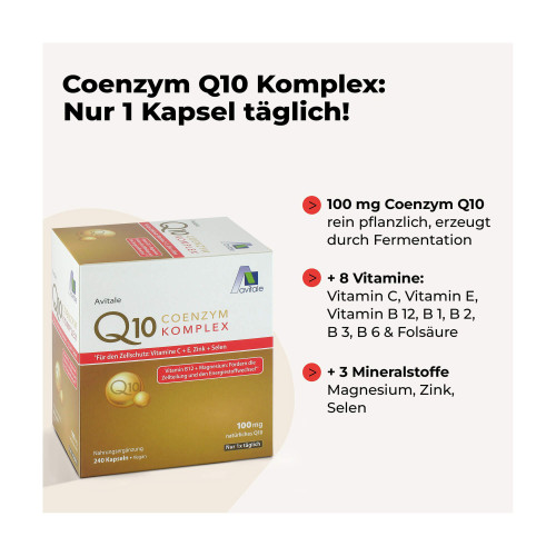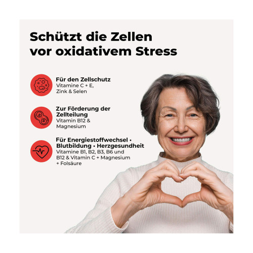 Nahrungsergänzungsmittel mit 100 mg rein pflanzlichem Coenzym Q10, Vitamin C und E sowie Zink und Selen zum Schutz der Zellen vor oxidativem Stress sowie Vitamin B12 und Magnesium zur Förderung der Zellteilung und für einen normalen Energiestoffwechsel.