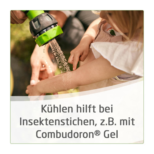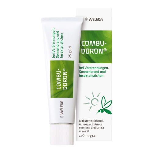 Combudoron Gel. Anwendungsgebiete: Gemäß der anthroposophischen Menschen- und Naturerkenntnis. Dazu gehören: Verbrennungen 1. und 2. Grades (Rötung, Schwellungen, Brandblasen), Sonnenbrand und akute Strahlenschäden der Haut; Insektenstiche. Warnhinweis: Enthält 20 Vol.-% Alkohol.